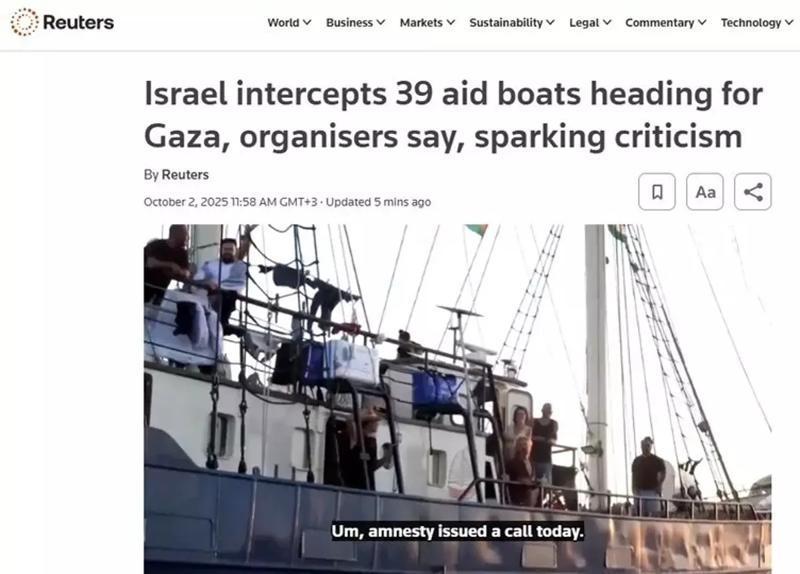 Uluslararası haber ajansı Reuters, "İsrail'in Gazze'ye yardım götüren 39 gemiyi durdurması tepkilere yol açtı" başlıklı haberinde, İsrail'in uluslararası tepkilerle karşı karşıya kaldığını bildirdi.