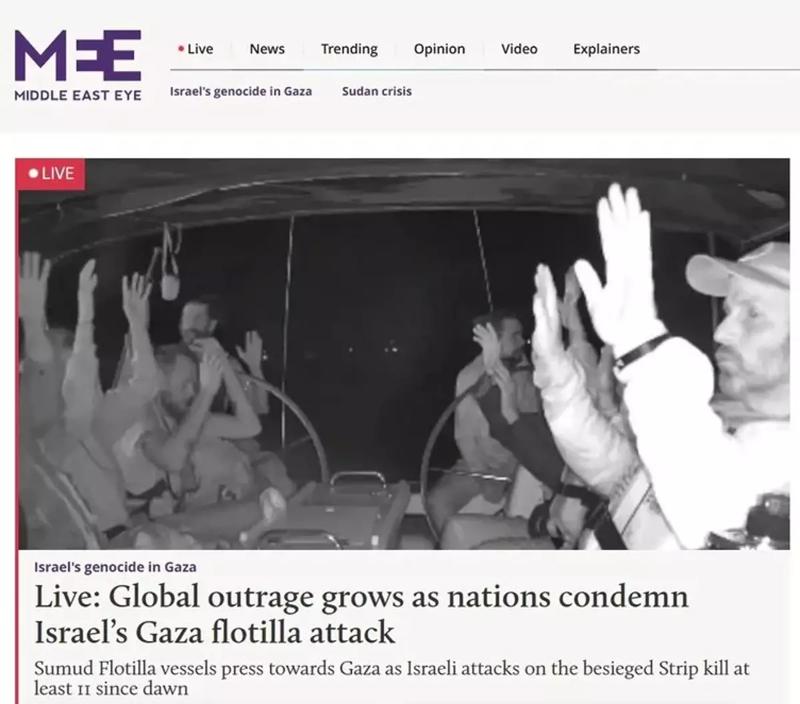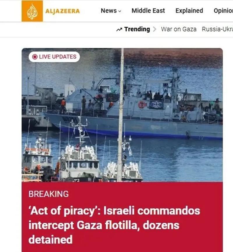 Katar merkezli El Cezire, Sumud Filosu'nda yaşanan gelişmeleri "Korsanlık eylemi: İsrail komandoları Gazze filosunu durdurdu! Onlarca kişi gözaltına alındı" başlığı ile verdi.