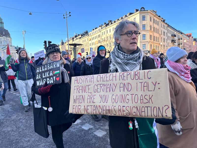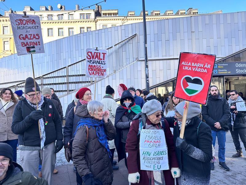 Eylemde, "Gazze'de çocuklar öldürülüyor", "Soykırımı durdurun" ve "Sonsuza kadar Filistin" yazılı pankartlar taşıyan göstericiler İsveç Parlamentosu ve Dışişleri Bakanlığı binalarının önlerine kadar yürüdü.