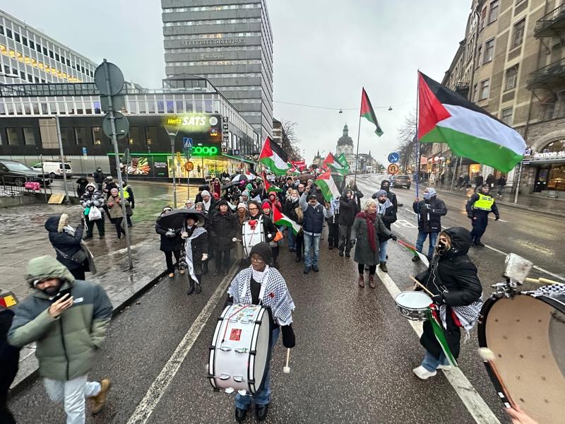 "Sivilleri bombalamak meşru müdafaa değil. Soykırıma hayır de", "Kurtuluşa erişene kadar direniş", "Filistin için ayağa kalkın", "Gıda kısıtlamasına son verilsin" ve "İsrail barış anlaşmasına uysun" yazılı dövizler taşıyan göstericiler, İsveç hükümetini İsrail'e karşı kapsamlı askeri ambargo uygulamaya davet etti.