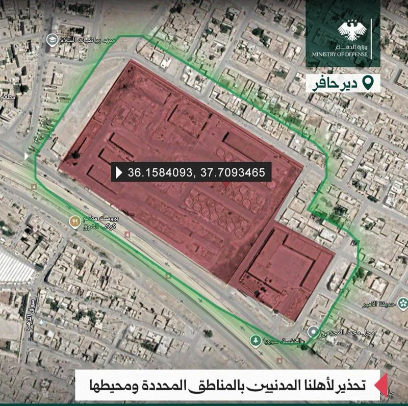 Suriye ordusu, olası operasyonda Fırat Nehri'nin batısındaki terör örgütü YPG/SDG'nin işgal altında yer alan Deyr Hafir beldesinde terör örgütünün yuvalandığı noktaların haritasını paylaşarak sivillere bu hedeflerden uzak durmaları çağrısı yaptı.