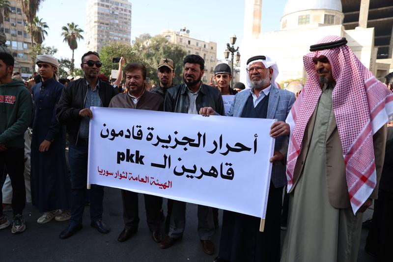 Göstericiler, "Eğer babalar burayı özgürleştirmezse, biz özgürleştireceğiz", "Cezire'nin özgür insanları PKK'yı ezerek geri dönecek", "Suriye, Cezire bölgesinde PKK/SDG çetelerinin varlığını reddediyor ve kabul etmiyor", "Ben her mazlumun yanındayım ama Mazlum Abdi'nin değil" ve "SDG demek baskı, tutuklama ve tehcir demektir" yazılı pankartlar taşıdı.