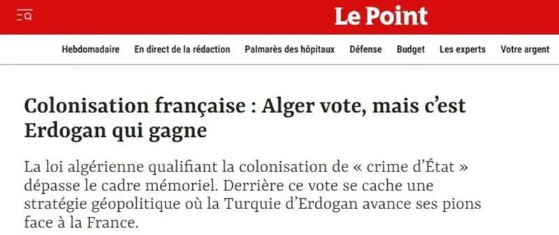 Cezayir Ulusal Halk Meclisi'nde düzenlenen oturumda Fransa'nın 1830 yılından 1962 yılına kadar ülkede gerçekleştirdiği sömürgecilik faaliyetlerinin suç ilan edilmesine yönelik yasa tasarısı oybirliği ile kabul edilirken, Cezayir Fransa'dan resmi özür ve tazminat talebinde bulundu. Söz konusu kararı değerlendiren Le Point, Fransa Cumhurbaşkanı Emmenuel Macron'un bu hezimetini 'Cumhurbaşkanı Erdoğan Kazandı' başlığıyla yayımladı. Haberde, Paris yönteminin Türkiye faktörünü yeterince hesaba katmadığı ifade edildi.