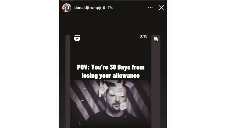 Donald Trump'ın oğlu Donald Trump Jr., Instagram hesabından Ukrayna Devlet Başkanı Zelenski'ye çok açık bir mesaj gönderdi. Zelenski'nin başından dolar yağdığı görülen videoda, "Harçlığını kaybetmene 38 gün kaldı" tepkisi gösterildi.