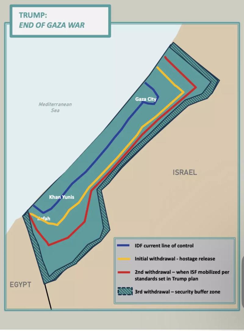 20 maddelik taslak planında İsrail'in üç aşamada geri çekilmesi öngörülüyor. Çekilmeler tamamlandığında dahi İsrail, Gazze'nin içinde güç bulunduruyor. 7 Ekim öncesi Mısır sınırında etkin olmayan İsrail o bölgeyi de kontrol ediyor.