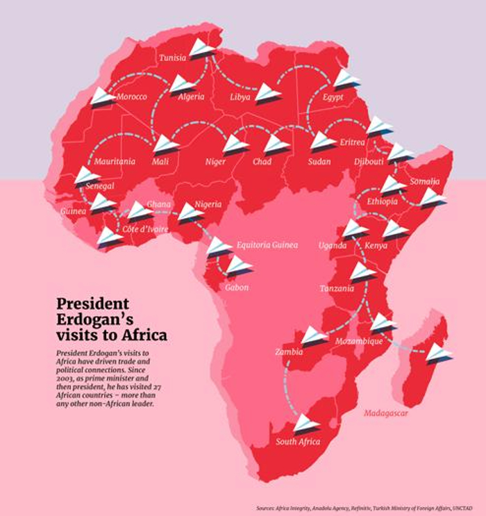Cumhurbaşkanı Erdoğan'ın göreve geldiği günden beri sıklıkla bölgeye ziyaretler düzenlediğine de değinildi. Haberde, "Genişleme, başbakan seçildiğinden bu yana 31 Afrika ülkesini ziyaret eden ve kıta dışında bir devlet başkanı için rekor bir sayı olan Cumhurbaşkanı Recep Tayyip Erdoğan'ın damgasını açıkça gösteriyor" tespitinde bulunuldu.