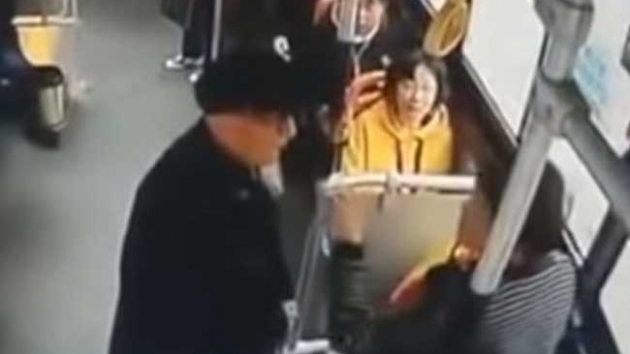 Güvenlik kamerasına yansıyan görüntüde, yaşlı bir adamın, oturmakta olan bir kadından yer istediği görülüyor. Ancak kadın yer vermeyi reddediyor ve ikili tartışmaya başlıyor.