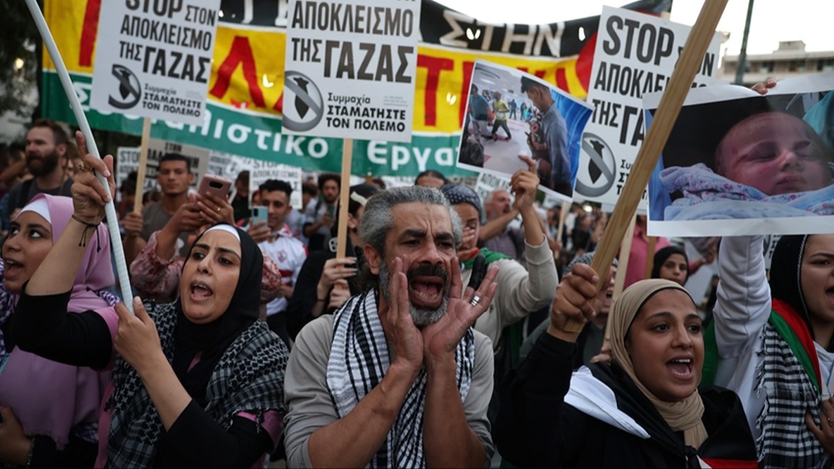 Eylemciler İsrail-Filistin çatışmasında ABD, NATO ve Avrupa Birliği'nin (AB) tutumunu da eleştirerek, Yunanistan'ın bu çatışmadan uzak kalmasını talep etti.