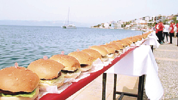 Sabahın erken saatlerinden itibaren Çeşme sahilinde çalışmaya başlayan, 21 ilden gelen 30 Mesleki ve Teknik Anadolu Lisesi öğrencisi, 370 metre uzunluğunda, 3 bin 777 adet hamburger yerleştirerek, dünyanın en uzun hamburgerini oluşturdu. Çeşme sahilinde kurulan tezgâha hamburgerleri birbirine değecek şekilde yerleştiren öğrenciler, büyük bir heyecan yaşadılar. Çeşme Noteri gözleminde uzunluğu ölçülen ve tek tek sayılan hamburgerler, Çeşme Noteri’nin onayının ardından Çeşme sahilinde rekor denemesine tanıklık eden binlerce vatandaş tarafından adeta kapışıldı. Video kaydı alınan rekor denemesi, Çeşme Noteri’nin tespit yazısı ile birlikte, onay için, dünya rekorlarını tescilleyen tek kurum olan Guinness’e gönderilerek tescillenmesi beklenecek. Dünyanın en uzun hamburgeri rekor denemesi, Gyrocopter ile havadan da görüntülendi.