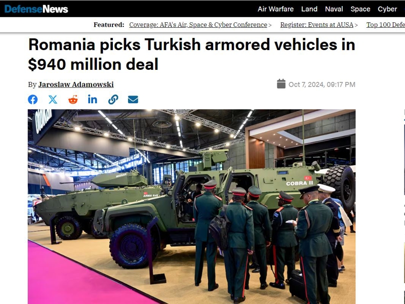 ABD merkezli medya kuruluşu Defense News, Romanya'nın kara kuvvetleri için Cobra II Hafif Zırhlı Taktik Tekerlekli Aracını seçtiğini gündemine aldı. Savunma alanında haber yapan ABD basını Defense News, Romanya'nın Türkiye'den toplamda 1.059 adet Cobra II siparişi verdiğini yazdı.