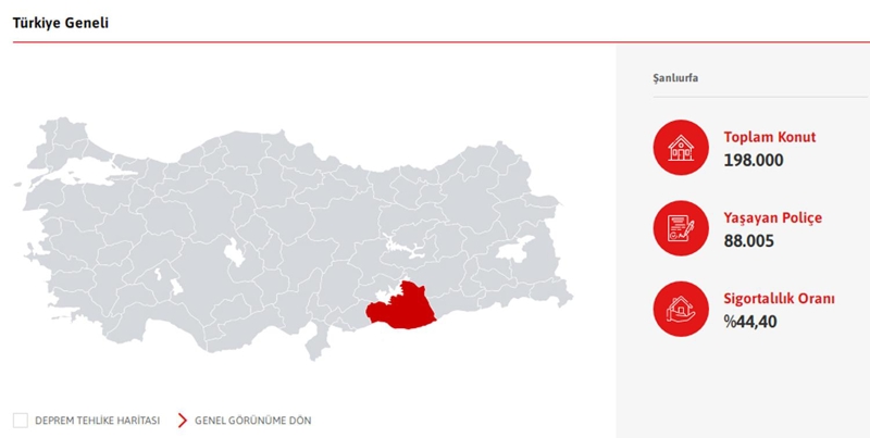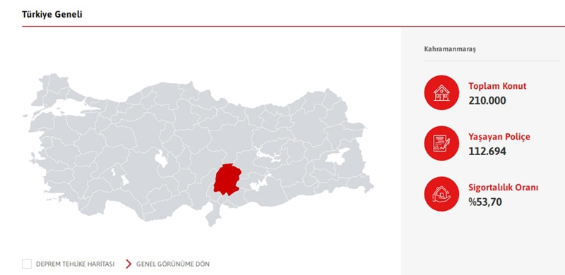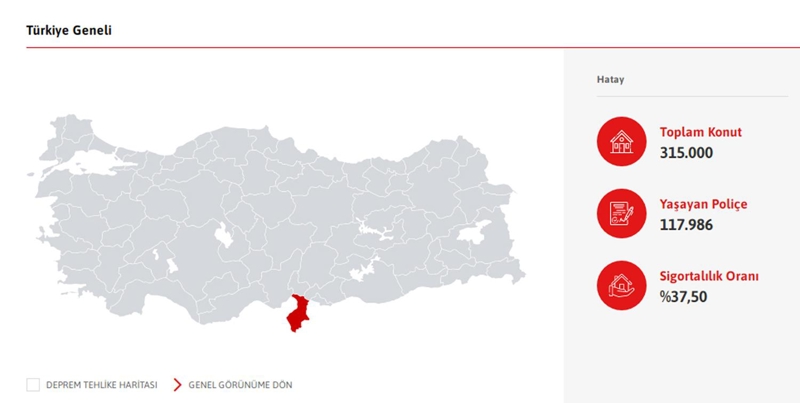 15 Mart 2023 verilerine göre; 6 Şubat'ta depremden etkilenen illerdeki veriler genelde çok düşük iken; bu illerden 9'unda DASK yaptıranların sayısı arttı, Şanlıurfa ve Hatay'da sayı ve oranlar düşüş gösterdi. Geçen yıl mart ve bu yıl şubat döneminde 11 ilde zorunlu deprem sigortası verileri şu şekilde oluştu. Hatay'da geçen yıl mart ayında 315 bin konuttan 123 bin 441'inde (yüzde 39,2) zorunlu deprem sigortası bulunurken, bu yıl şubat döneminde sigortalı konut sayısı 117 bin 986'ya, toplam sigortalı konut oranı ise yüzde 37,5'e geriledi. Aynı dönemde Şanlıurfa'da 198 bin konuttan 102 bin 204'ü (yüzde 51,6) sigortalıyken, konut sayısı 88 bin 5'e, oran yüzde 44,4'e geriledi. Adıyaman'da 89 bin konutun 38 bin 657'si (yüzde 43,4) sigortalıyken, konut sayısı 40 bin 85'e, oran yüzde 45'e çıktı. Kahramanmaraş'ta 210 bin konuttan 109 bin 445'i (yüzde 52,1) sigortalıyken, konut sayısı 112 bin 694'e, oran yüzde 53,7'ye çıktı. Gaziantep'te 339 bin konuttan 213 bin 729'u (yüzde 63) sigortalıyken, konut sayısı 228 bin 565'e, oran yüzde 67,4'e yükseldi. Osmaniye'de 101 bin konuttan 43 bin 155'i (yüzde 42,7) sigortalıyken, konut sayısı 61 bin 447'ye, oran yüzde 60,8'e yükseldi. Kilis'te 25 bin konuttan 14 bin 623'ü (yüzde 58,5) sigortalıyken, konut sayısı 16 bin 348'e, oran yüzde 65,4'e çıktı. Malatya'da 188 bin konuttan 96 bin 646'sı (yüzde 51,4) sigortalıyken, konut sayısı 116 bin 166'ya, oran yüzde 61,8'e çıktı. Elazığ'da 135 bin konuttan 87 bin 72'si (yüzde 64,5) sigortalıyken, konut sayısı 94 bin 574'e, oran yüzde 70,1'e yükseldi. Diyarbakır'da 231 bin konuttan 78 bin 774'ü (yüzde 34,1) sigortalıyken, konut sayısı 87 bin 285'e, oran yüzde 37,8'e çıktı. Adana'da 479 bin konuttan 222 bin 233'ü (yüzde 46,4) sigortalıyken, konut sayısı 272 bin 742'ye, oran yüzde 56,9'a yükseldi.