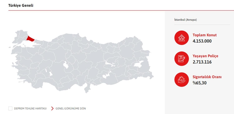 Özellikle kamuoyunda çokça konuşulan deprem beklentisi nedeniyle deprem sigortası bilinci yüksek iller arasında gösterilen İstanbul'da toplam 4 milyon 153 bin konuttan yüzde 64,9'unun zorunlu sigortası bulunurken, geçen yıl mart ayına göre bu yıl şubat ayı itibarıyla sigortalı konut oranı yüzde 65,3'e yükseldi. İstanbul'da zorunlu deprem sigortası bulunan konut sayısı, 2 milyon 693 bin 890 adet oldu. Zorunlu deprem sigortası oranı; Ankara'da 1 milyon 719 bin konutun 979 bini (yüzde 57), Antalya'da 713 bin konutun 415 bin 278'i (yüzde 58,2), Konya'da 584 bin konutun 257 bini (yüzde 44), Mersin'de 492 bin konutun 308 bini (yüzde 62,8), Kayseri'de 376 bin konutun 243 bini (yüzde 64,8), Muğla'da 271 bin konutun 226 bini (yüzde 83,5), Trabzon'da 232 bin konutun 97 bini (yüzde 41,9), Kocaeli'de ise 481 bin konutun 338 bini (yüzde 70,5) şeklinde oldu.
