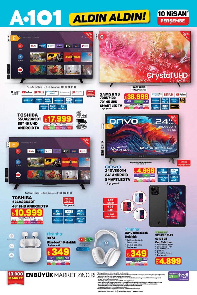 A101 10 Nisan 2025 aktüel ürünler kataloğu yayınlandı. A101 kataloğunda bu hafta; Beyaz Eşya ve Elektrikli Ev Aletleri, Modern Ev Mobilyaları, Bebek Ürünleri, Tekstil, Züccaciye ve Mutfak ürünleri grubunda çeşitli fırsatlar yer alıyor. A101 Aldın Aldın etiketi ile hazırlanmış olan kataloğun ilk sayfasında 4 farklı boyutta ve fiyatta televizyon yer alıyor. Peki A101'de bu hafta başka neler var? İşte A101 10 Nisan 2025 aktüel ürünler kataloğu