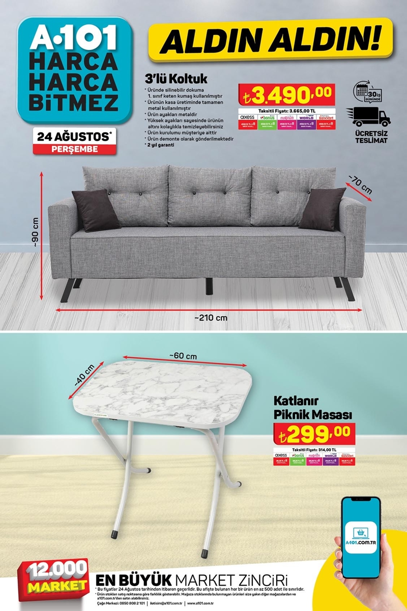A101 kataloğunda yer alan Ev Eşyaları grubunda 1. sınıf keten kumaş ve silinebilir dokuma yüzeyi, metal kasa özelliği, demonte olarak telimi yapılacak 2 yıl garantili 3'lü Koltuk 2799 TL, Yine Demonte olarak satışa sunulacak 2 yıl garantili Berjer 1599 TL fiyattan sipariş bekliyor olacak.