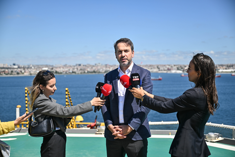 Bakan Bayraktar, İstanbul Boğazı'nı geçerek Karadeniz'e çıkacak Abdülhamid Han sondaj gemisinde basın mensuplarına açıklama yaptı.