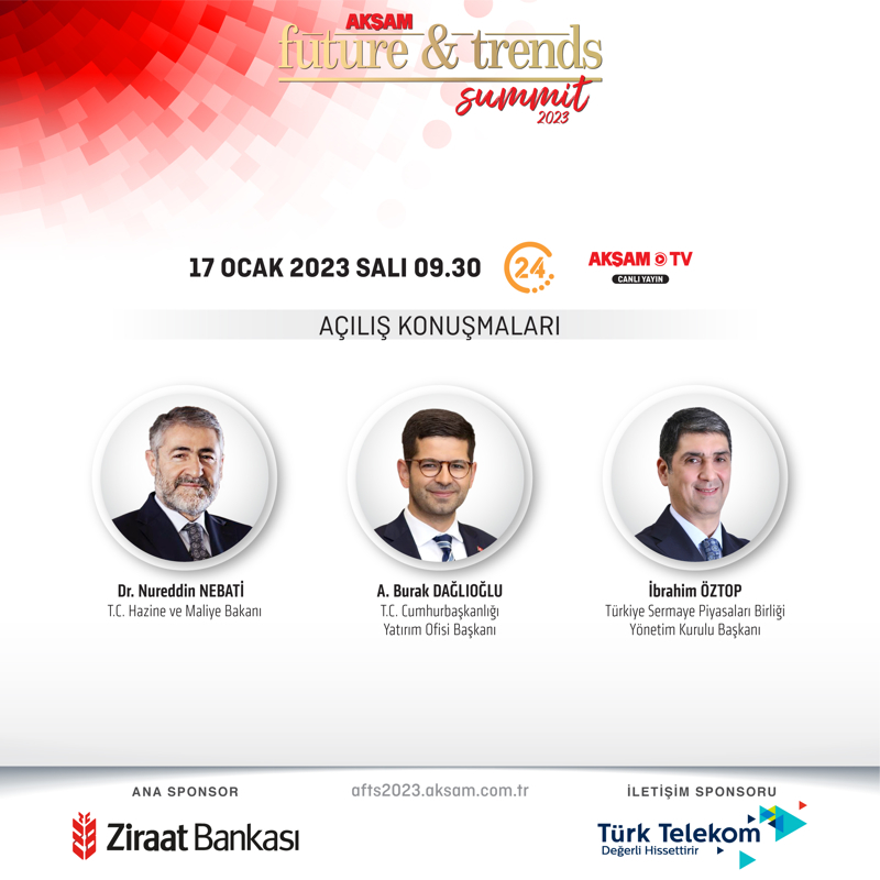 AKŞAM Gazetesi tarafından bu yıl ilk kez düzenlenen "AKŞAM Future & Trends Summit" zirvesi bugün gerçekleştirilecek. Zirvede Türk ekonomisine yön veren sektörlerin 'gelecek&trendler'i masaya yatırılacak. Zirvenin açılış konuşmasını ise Hazine ve Maliye Bakanı Nureddin Nebati yapacak. Cumhurbaşkanlığı Yatırım Ofisi Başkanı Burak Dağlıoğlu ile birlikte Türkiye Sermaye Piyasaları Birliği Başkanı İbrahim Öztop'un da konuşmacılar arasında yer aldığı zirvede ele alınacak başlıklar "yatırım, finans ve sigorta, otomotiv, inşaat, çevre ve şehircilik, e-ticaret ve perakende" olarak belirlendi. Zirvede 4 ayrı oturum gerçekleşecek.