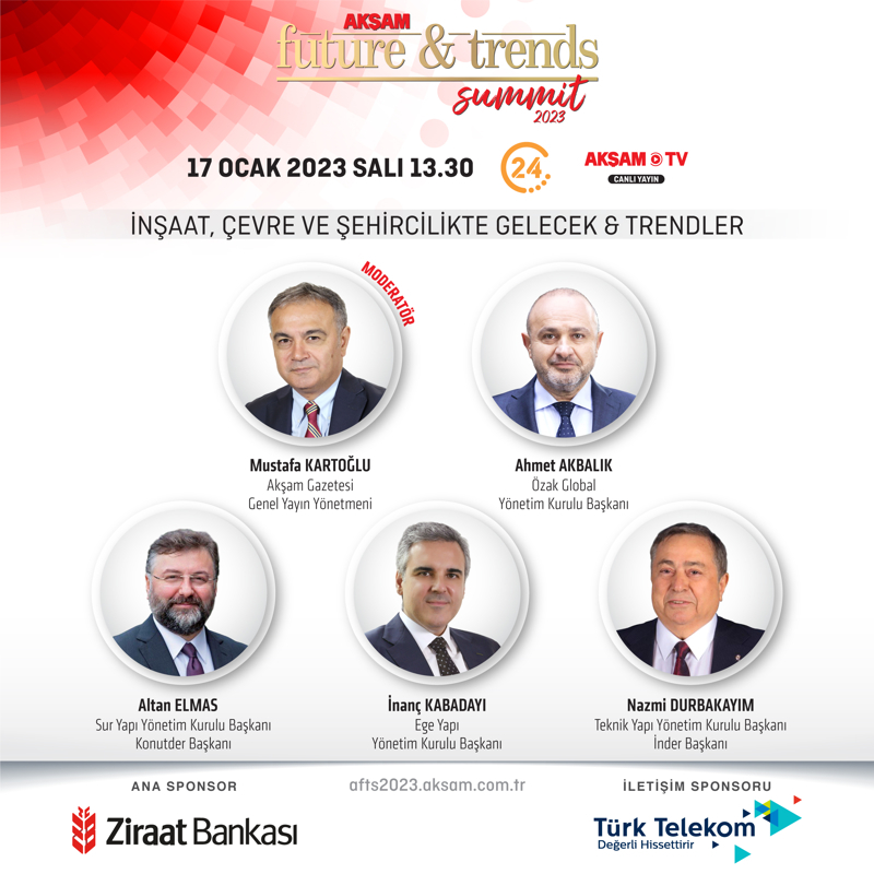 AKŞAM Gazetesi Genel Yayın Yönetmeni Mustafa Kartoğlu'nun moderatörlüğünü yaptığı 'İnşaat, Çevre ve Şehircilik' oturumunun konuşmacıları ise Özak GYO Yönetim Kurulu Başkanı Ahmet Akbalık, Sur Yapı Yönetim Kurulu Başkanı Altan Elmas, Ege yapı Yönetim Kurulu Başkanı İnanç Kabadayı ve Teknik Yapı Yönetim Kurulu Başkanı Nazmi Durbakayım olacak. Zirve Akşam TV ve 24'ten de yayınlanacak.