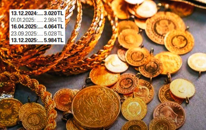 Gram altın fiyatı 5.956 liraya çıkarak tarihi zirvesini gördü. Fed'in faiz indirimleri ve dolar endeksindeki gerileme, altındaki yükselişi hızlandırdı. Yılbaşında 2.984 liradan işlem gören gram altın yılın tamamlanmasına sayılı günler kala 5 bin 956 liraya kadar yükseldi. Böylece gram altın yılın başından bu yana yüzde 100 oranında değer kazanmış oldu.