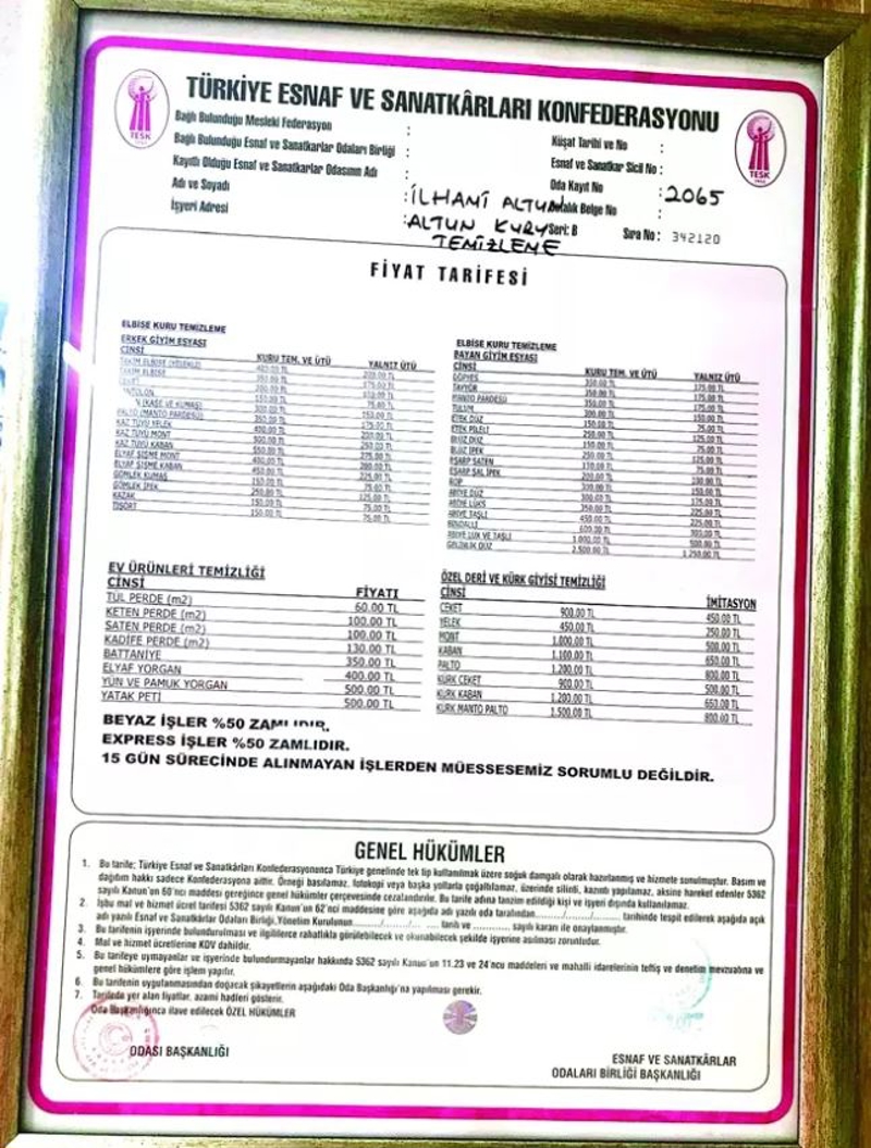 Oda fiyatlarına göre bir takım elbiseyi 400 TL'ye temizlemem gerektiğini ancak kendisinin bir takımı 130 TL'ye yaptığını belirten İlhami Altun, şunları söyledi: "Bu zamlar çoğunlukla esnaftan kaynaklanıyor. Devletle ne alakası var, esnafın açgözlülüğü, doyumsuzluğu fahiş fiyatlarda etkili oluyor. Bakın size hesabını yapayım. Temizlikte kullandığımız bir yıldan fazla gidiyor. Kaynatıp kaynatıp kullanıyorsun. Bir makinenin bir sefer çalışması ortalama olarak 30 TL. Bu makine 25 parça alıyor. 25 parçadan, ben düşük fiyattan yapıyorum ya 50 TL'den 1250 TL eder. Bir makineden 1250 TL'de benim giderim 30 TL, hadi kira vs. maliyetlerini de ekle 100 TL, geriye kalıyor 1150 TL. Bu kadar da açgözlülük olmaz ki."