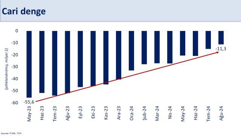 Hazine ve Maliye Bakanı Mehmet Şimşek, ağustosta 4,3 milyar dolar ile 5 yılın aylık en yüksek cari fazlası verildiğini, yıllık cari açığın 11,3 milyar dolar olduğunu belirterek "Böylece 2023 yılı mayıs ayına göre yıllık cari açıktaki düşüş 44,4 milyar dolara ulaştı." ifadesini kullandı.
