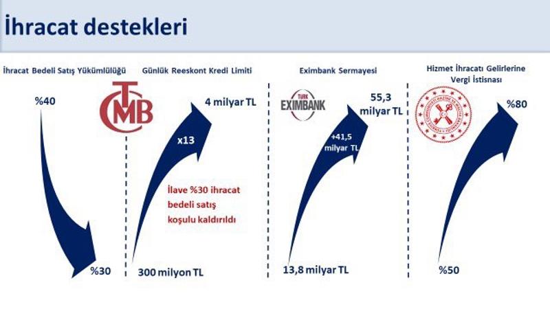 Bakan Şimşek, sosyal medya hesabından yaptığı açıklamada, "İhracatçılarımızın daha uygun koşullarla finansmana erişimi için reeskont kredi maliyeti yüzde 35'ten yüzde 29,9'a düşürüldü. Programımız döneminde; reeskont kredi limiti artırıldı (günlük 300 milyon TL'den 4 milyar TL'ye), reeskont kredilerinde ilave ihracat bedeli satış koşulu kaldırıldı (yüzde 30'dan yüzde 0'a), ihracat bedeli satış yükümlülüğü azaltıldı (yüzde 40'tan yüzde 30'a), Eximbank'ın sermayesini güçlendirdik (13,8 milyar TL'den 55,3 milyar TL'ye), hizmet ihracatı gelirlerine vergi istisnasını artırdık (yüzde 50'den yüzde 80'e). Rekabet gücümüzü ve verimliliği artırmak için katma değerli üretimi ve ihracatı desteklemeye devam edeceğiz" dedi.