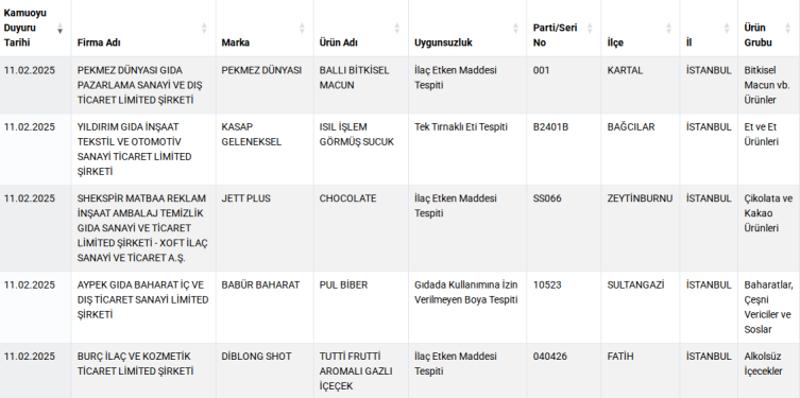 11 Şubat tarihli listeye göre; İstanbul Bağcılar'daki Yıldırım Gıda'nın çıkarttığı "Kasap Geleneksel" markası ısıl işlem görmüş sucukta, tek tırnaklı eti çıktı. Osmaniye'de Beypa Gıda'nın ürettiği sucukta da kanatlı eti ve sakatat-baş eti görüldü.