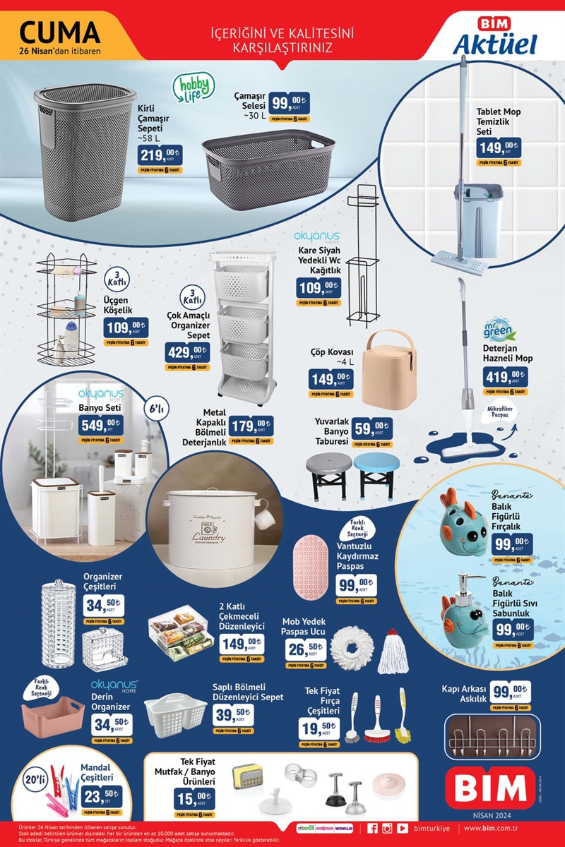 26 Nisan 2024 BİM aktüel ürünler kataloğunun diğer bir sayfasında; Okyanus Home Banyo Seti 549 TL, Benante Balık Figürlü Fırçalık 99 TL, Benante Balık Figürlü Sıvı Sabunluk 99 TL, Tek Fiyat Fırça Çeşitleri 19,50 TL, Mob Yedek Paspas Ucu 26,50 TL, Mandal Çeşitleri 23,50 TL, Tek Fiyat Mutfak-Banyo Ürünleri 15 TL, Vantuzlu Kaydırmaz Paspas 99 TL olarak raflarda yerini alacak.