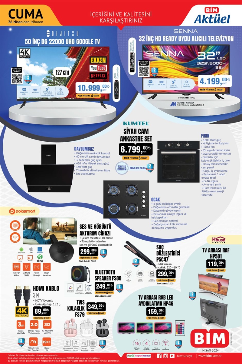Bu Cuma BİM'de harika ürünlerin 26 Nisan tarihinden itibaren satışa sunulacak olan Bim Aktüel ürünleri devamında Elektrikli El aletleri grubunda Davlumbaz-Fırın-Ocak üçlüsünden oluşan Kumtel Siyah Cam Ankastre Set 6,799 TL, Polosmart Ses ve Görüntü Aktarım Cihazı 299 TL, HDMI Kablo 89 TL, Bluetooth Speaker 249 TL, TWS Kulaklık 349 TL, TV Arkası Raf 119 TL, TV Arkası Led Aydınlatma 159 TL olarak raflarda yerini alacak.