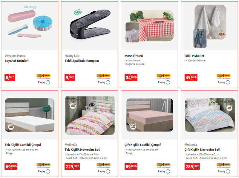 Erkek Eşofman Alt 89 TL, Kadın – Erkek Modal Tişört 69 TL, Ören Bayan Yazma 34,50 TL, Microfiber Bulaşık Altlığı 19,50 TL, Masa Örtüsü 34,50 TL, İkili Havlu Set 49,50 TL, Tek Kişilik Lastikli Çarşaf 69 TL, Molinella Tek Kişilik Nevresim Seti 229 TL, Çift Kişilik Lastikli Çarşaf 89 TL, Molinella Çift Kişilik Nevresim Seti 289 TL olarak satılacak.