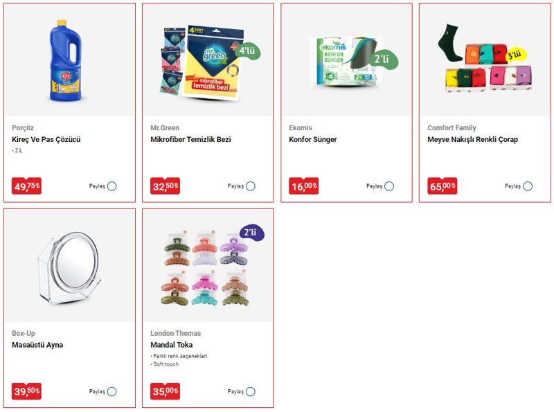 Yumoş 1200 ml Konsantre Yumuşatıcı 55 TL, Porçöz 2 Litre Kireç Ve Pas Çözücü 49,75 TL, Jkosmec Kağıt Yüz Bakım Maskesi 14,75 TL, Su Hayat Özel Disney Karakterli 330 ml 5 TL, Belinno 32'li Deluxe Tuvalet Kağıdı 139,50 TL, Neutrogena 200 ml Yüz Temizleme Jeli 59,75 TL, Naturalove Yeşim Taşlı Yüz Masaj Aleti 69,75 TL, Comfort Family Meyve Nakışlı Renkli Çorap 65 TL, Rituel De Beaute Jel Göz Altı ve Dudak Maske Seti 49,75 TL fiyattan satışa sunulacak.