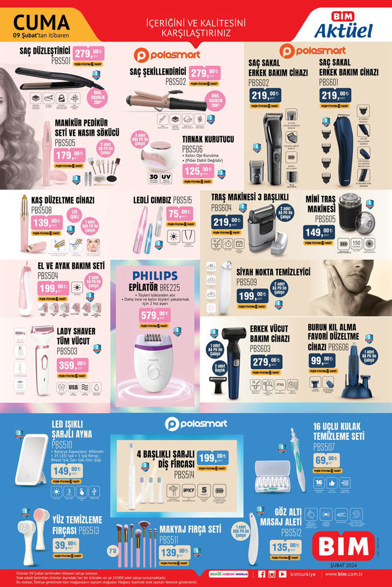 BİM'de bu hafta kişisel bakım ürünleri geniş yer kaplıyor. Bu ürünlerde; Polosmart Saç Düzleştirici 279 TL, Polosmart Saç Şekillendirici 279 TL, Polosmart Saç Sakal Erkek Bakım Cihazı 219 TL, Polosmart Kaş Düzeltme Cihazı 139 TL, Polosmart Manikür Pedikür Seti ve Nasır Sökücü 179 TL, Polosmart Tırnak Kurutucu 125 TL, Polosmart Ledli Cımbız 75 TL,