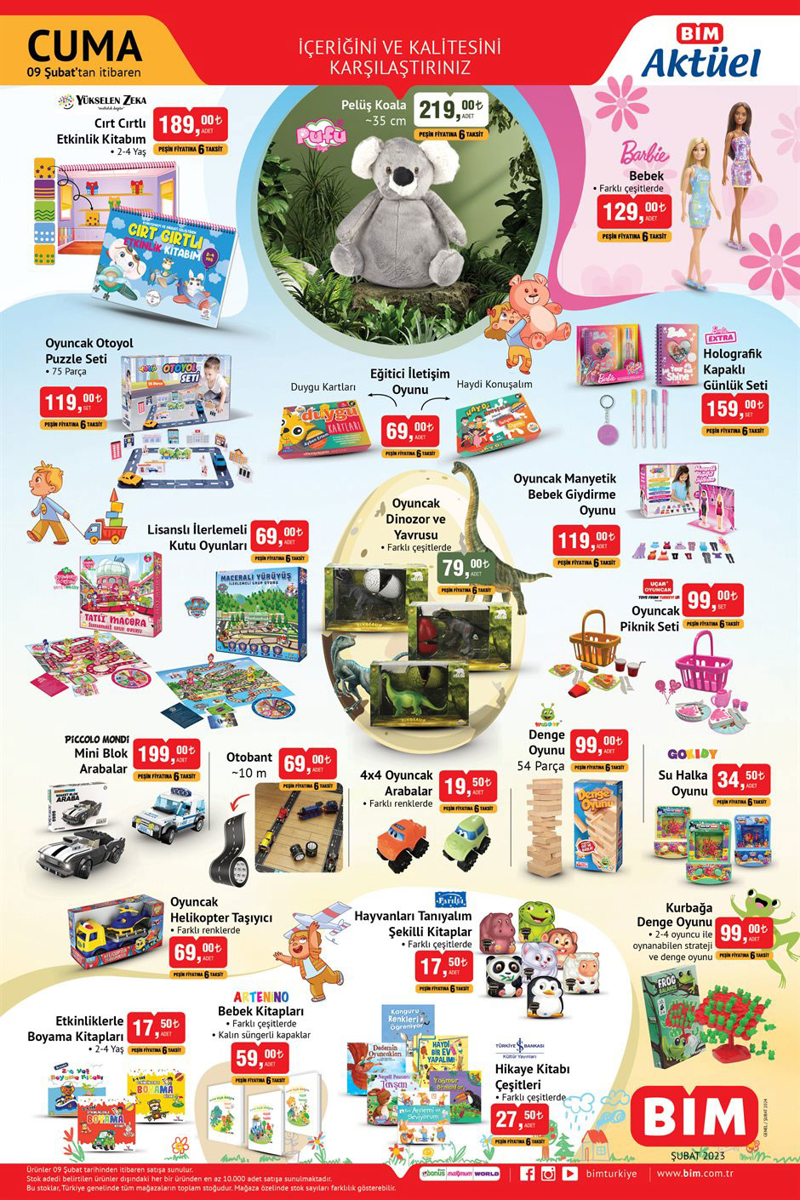 BİM'de Çocuklar için özenle seçilmiş olan Eğitici ve Öğretici Oyuncaklar yer alacak. Oyuncak kapsamında hazırlanmış ürünlerde; Cırt Cırtlı Etkinlik Kitabım 189 TL, Pelüş Koala 35 cm 219 TL, Holografik Kapaklı Günlük Seti 159 TL, Oyuncak Manyetik Bebek Giydirme Oyunu 119 TL, Denge Oyunu 54 Parça 99 TL, Hayvanları Tanıyalım Şekilli Kitaplar 17,50 TL, Hikaye Kitabı Çeşitleri 27,50 TL olarak yer alıyor.