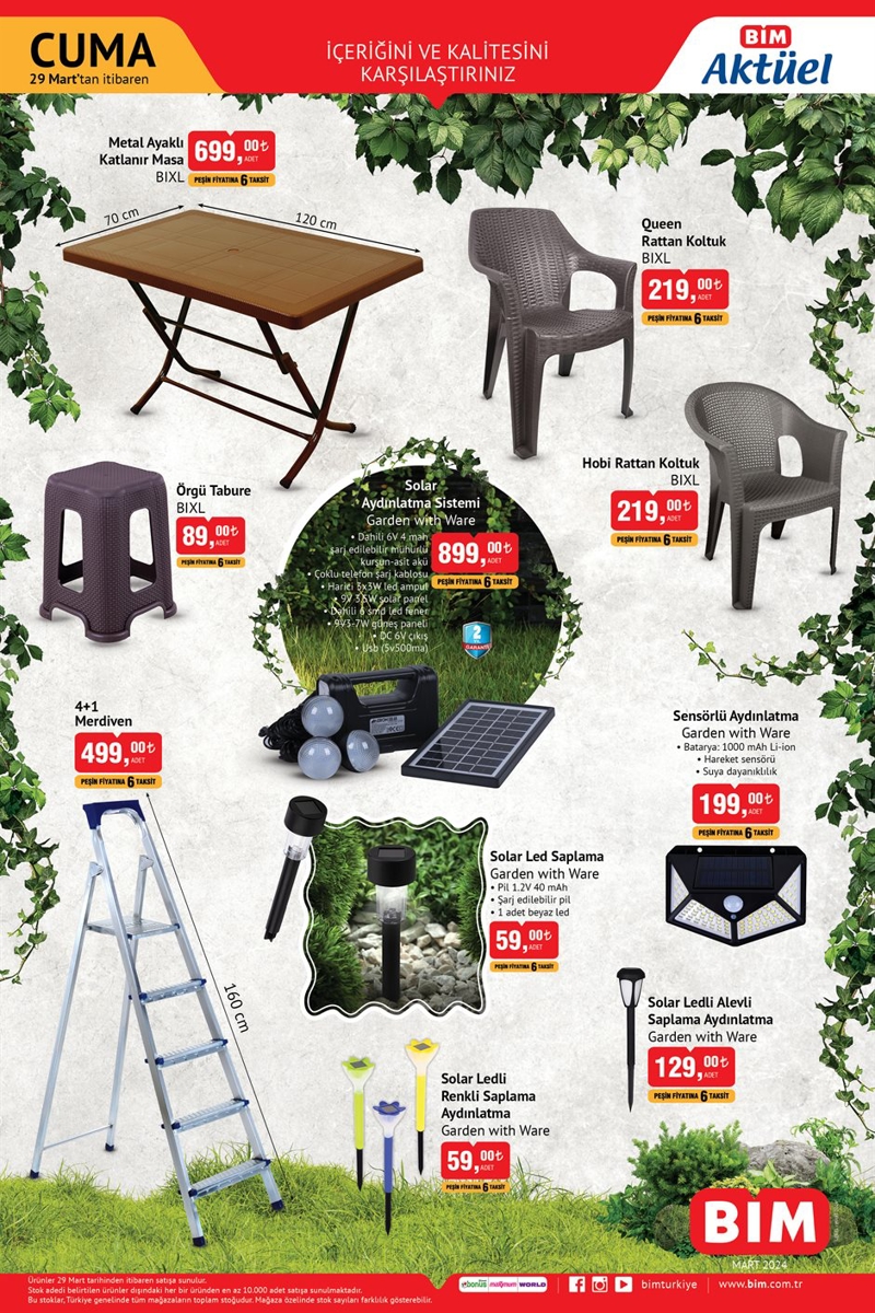 BİM Aktüel 29 Mart 2024 Kataloğundaki Bahçe ve Balkon kategorisinde; Katlanır Masa 699 TL, Örgü Tabure 89 TL, Hobi Rattan Koltuk 219 TL, Senörlü Aydınlatma 199 TL, Solar Ledli Alevli Saplama Aydınlatma 129 TL, Solar Led Saplama 59 TL, Solar Ledli Renkli Saplama Aydınlatma 59 TL, Solar Aydınlatma Sistemi 899 TL, Merdiven 4+1 Basamaklı 499 TL fiyatı ile dikkat çekiyor.