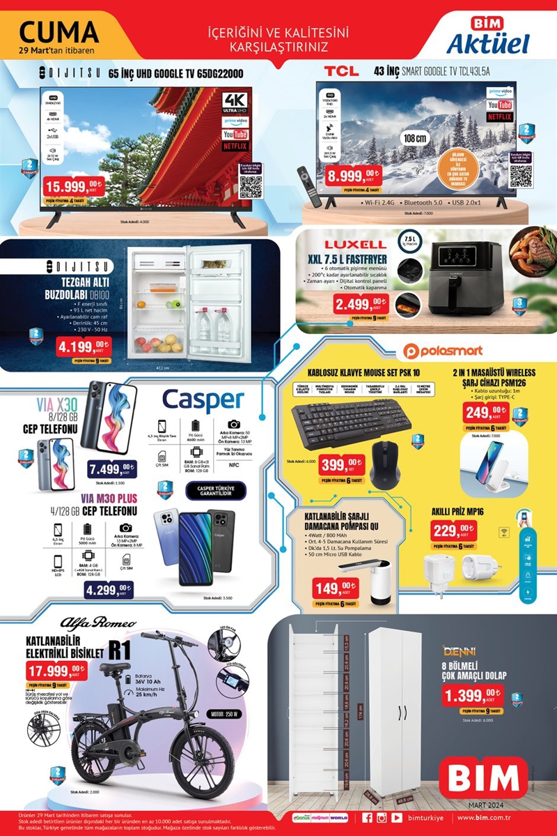 BİM'de bu hafta cuma günü Teknoloji grubunda harika ürünler yer alıyor. BİM 29 Mart Cuma tarihli aktüel ürünler kataloğun ilk sayfasında Dijitsu 65 İnç Frameles Full HD Google TV 15,999 TL, 4K ultra HD özellikli akıllı kumandalı TCL 43 İnç Google TV 8,999 TL, 8 GB Ram ve 128 GB dahili hafızaya sahip olan Casper VIA X30 Cep Telefonu 7,499 TL, 4 GB Ram ve 128 GB dahili hafızaya sahip Casper VIA M30 Cep Telefonu 4,299 TL'den satışa sunulacak.
