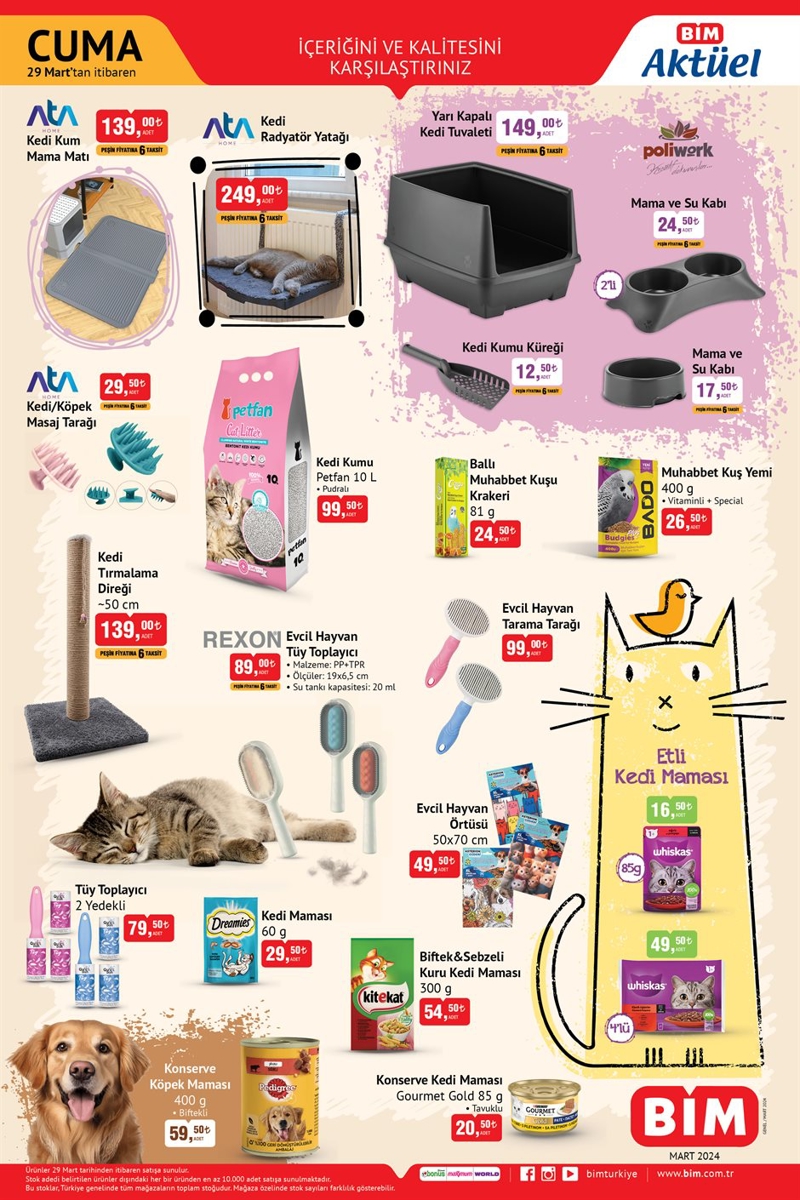 BİM 29 Mart 2024 aktüel ürünler kataloğu yayınlandı. BİM'de bu cuma; Evcil hayvan ürünleri, Teknoloji Ürünleri, Elektrikli Ev Aletleri, Züccaciye ve Mutfak Ürünleri, Tekstil ve giyim Ürünleri ile Oyuncaklar yer alıyor. BİM'de bu hafta metal ayaklı katlanır masa 699 TL, rattan koltuk ise 219 TL fiyatıyla öne çıkıyor. İşte BİM aktüel ürünler kataloğu