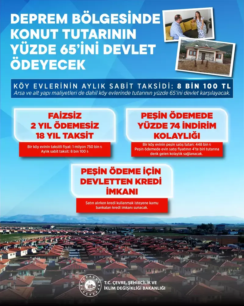 Çevre, Şehircilik ve İklim Değişikliği Bakanlığından da konuya ilişkin yapılan açıklamaya göre, tüm afet konutlarının ödeme takvimi anahtar tesliminden 2 yıl sonra başlayacak.