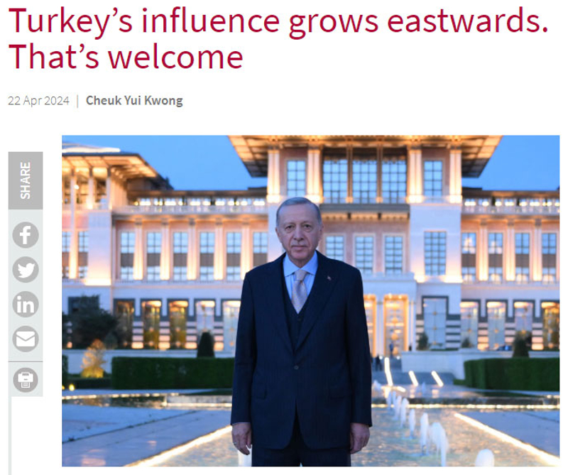 2019'dan bu yana Türkiye'nin Japonya, Güney Kore, Güneydoğu Asya ülkeleri, Orta Asya'daki Türk devletleri ve Afrika Boynuzu'ndaki ülkelerle bağlarını güçlendirmeye çalıştığına vurgu yapılan yazıda, "Türkiye, Doğu Asya'daki Müslüman ülkeler ve gelişmiş ekonomilerle daha yakın ilişkiler kurmak amacıyla 2019 yılında Yeniden Asya Girişimi'ni açıklamıştı. Malezya, Bangladeş, Güney Kore ve Filipinler ile güvenlik ve savunma iş birliğini güçlendirdi. Zaten Afrika Boynuzu'nda bulunan Türkiye, Somali, Sudan ve Etiyopya ile askeri işbirliği yoluyla nüfuzunu önemli ölçüde artırdı. Somali'deki ekonomik varlığı 2010 yılından bu yana genişlemektedir. Dikkate değer başarılar arasında Mogadişu limanlarının 2014 yılında yeniden açılması ve Somali Ulusal Ordusunu desteklemek için bir askeri eğitim kampı kurulması yer almaktadır" ifadeleri kullanıldı.