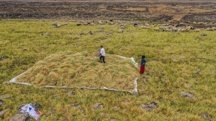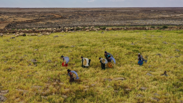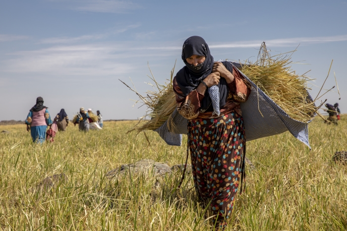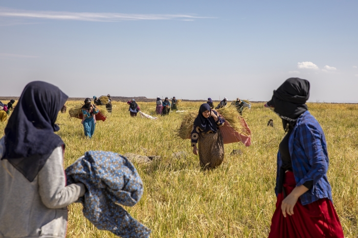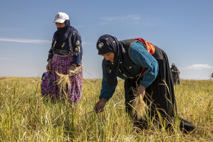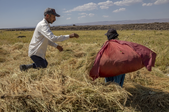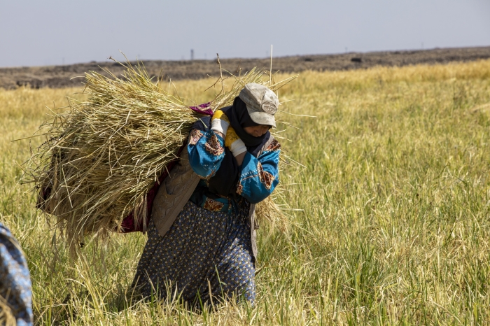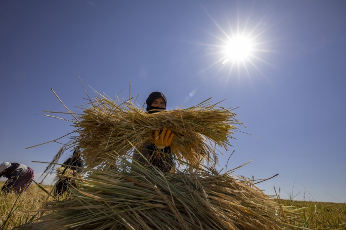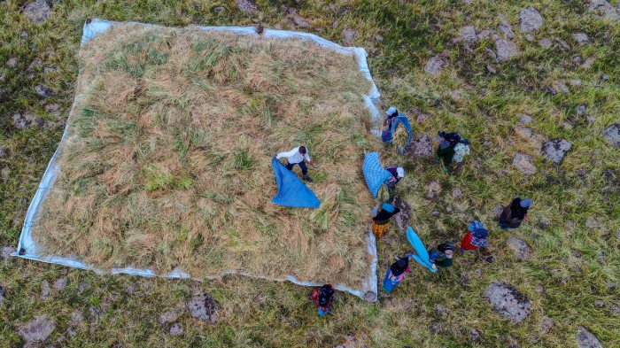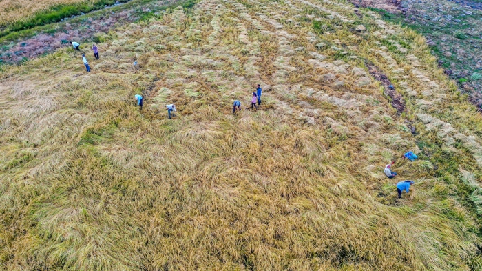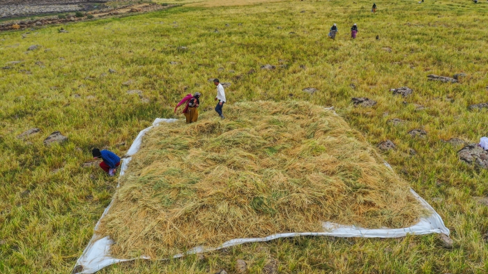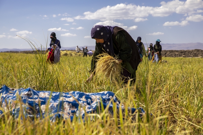 Taşlı arazide zorlu hasat döneminde pirincin başaklarını erkekler orakla biçiyor, kadınlar da elleriyle topladıkları ürünü heybelerle taşıyor.