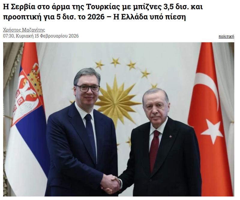 Yunanistan'ın bir zamanlar Balkanlar'ın önde gelen yatırımcısı olduğu şimdi ise durumun tersine döndüğünü belirten Yunan basını, "Türkiye şimdi savunma anlaşmalarını devasa altyapı paketlerine (yollar, enerji) bağlıyor. Türkiye-Sırbistan ticaret hacmi için 2026 yılına kadar belirlenen 5 milyar dolarlık hedef, Yunanistan'ın karşılık gelen performansını çok aşıyor ve Ankara'yı Belgrad için daha da "vazgeçilmez" kılıyor" ifadelerini kullandı.