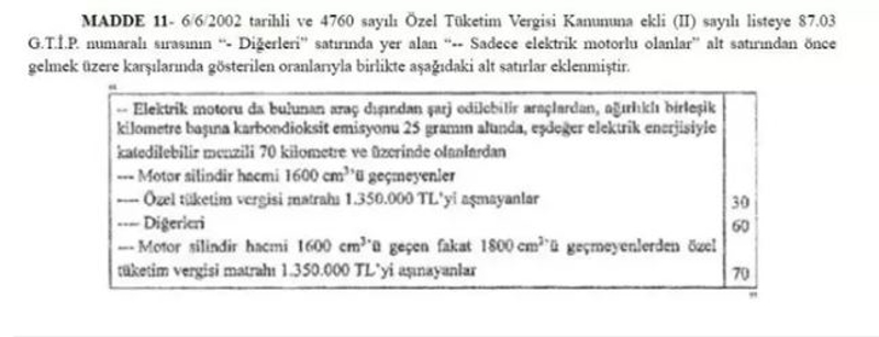 Kamuda tasarrufun artırılması amacıyla hazırlanan yasa düzenlemesi Resmi Gazete'de yayımlandı. Düzenlemeyle birlikte şarj edilebilen 70 kilometrenin üzerinde menzile sahip hibrit araçlara ÖTV indirimi yapıldı.