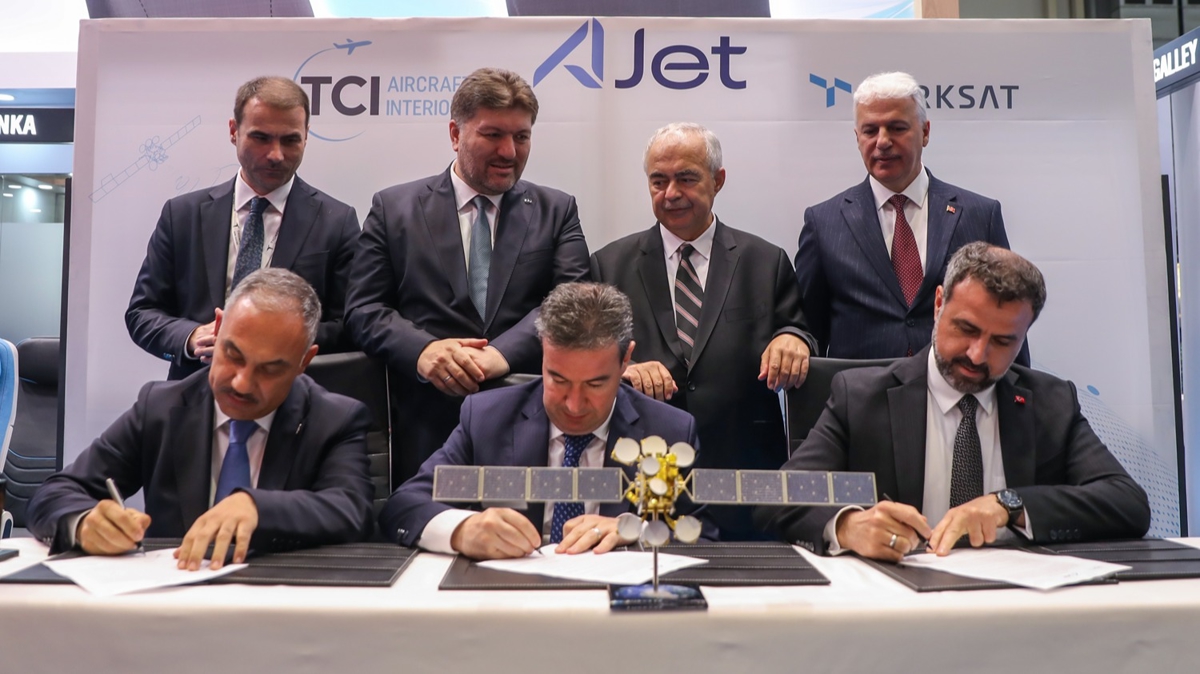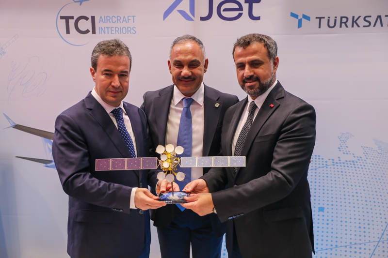 AJet filosuna yönelik tasarlanan Uçak İçi Bağlantı (IFC) sisteminin oluşturulması için iyi niyet protokolü, Almanya'nın Hamburg kentinde düzenlenen ve havacılık sektörünün önde gelen fuarlarından AIX 2024'te (Aircraft Interiors Expo - Uçak Kabin İçi Ekipmanları Fuarı) AJet Genel Müdürü Kerem Sarp, Türksat Genel Müdürü Hasan Hüseyin Ertok ve TCI Aircraft Interiors Genel Müdürü Müjdat Uludağ tarafından imzalandı.