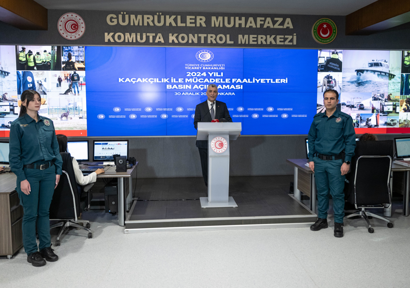 Ticaret Bakanı Ömer Bolat, Gümrükler Muhafaza Genel Müdürlüğü Komuta Kontrol Merkezi'nde 2024 Yılı Kaçakçılık Verileri Değerlendirme Toplantısı'na katıldı. Toplantıda Bakan Bolat'ın komuta kontrol merkezindeki sistemlerin çalışma esaslarını incelemesinin ardından, kaçakçılık suçlarının önlenmesine ilişkin video gösterimi gerçekleştirildi.