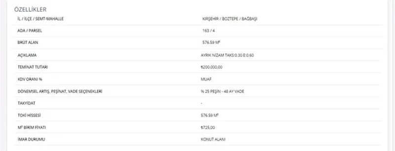 TOKİ tarafından 4.543 TL taksitle arsa almak da mümkün olabiliyor. Söz konusu açık artırmaya çıkartılacak taşınmaz, Kırşehir Boztepe Bağbaşı'nda bulunuyor. İşte o arsa;