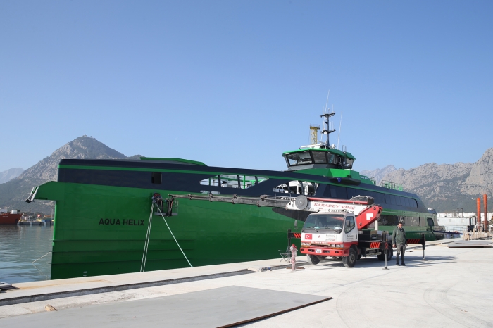 Antalya Serbest Bölge'de faaliyet gösteren Hollanda firması tarafından yapılan 70 metrelik gemi, iki paletli vinç yardımıyla denize indirildi.