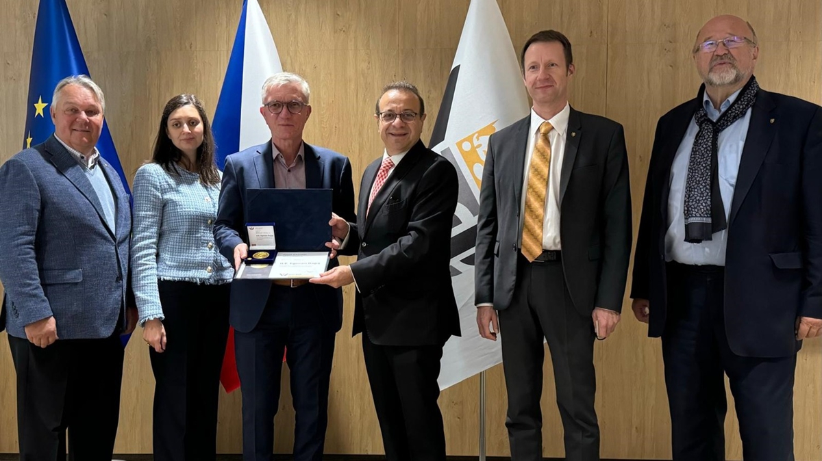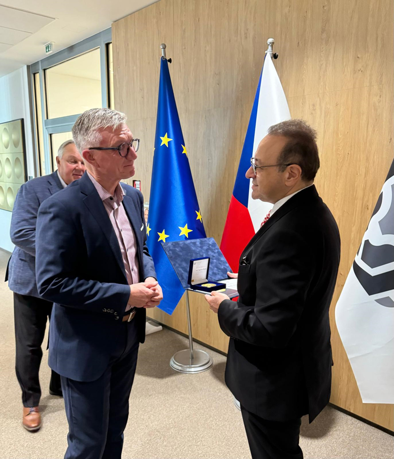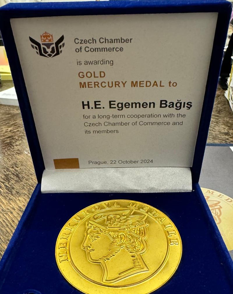 Zajıcek, yönetim kurulu üyeleriyle beraber kurumun en önemli nişanı "Altın Merkür Madalyası"nı Bağış'a takdim etti.