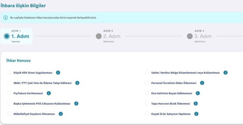 Vatandaşlar, düşük KDV oranı uygulanması, IBAN/PTT çeki yoluyla ödeme talep edilmesi, fiş/fatura verilmemesi, düşük KDV oranı uygulanması, IBAN/PTT çeki yolu ile ödeme talep edilmesi, başka işletmenin POS cihazının kullanılması, mükellefiyet kaydının olmaması, sahte/yanıltıcı belge düzenlenmesi veya kullanılması, personel ücretinin elden ödenmesi, kira gelirinin beyan edilmemesi, tapu harcının eksik ödenmesi ve kaçak ürün satışının yapılması gibi konularda ihbarda bulunabilecek.