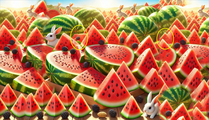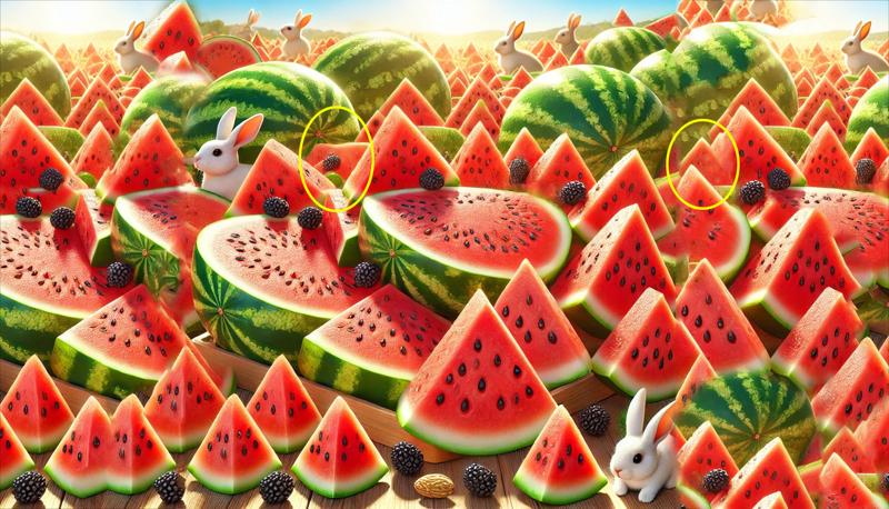Bu testte çözümü zorlaştırmak için görsele üç tavşan da eklenmiş. Tavşanlar, dikkatinizi çekirdeksiz karpuzlardan uzaklaştırabilir. Zorlayıcı unsurlar, çözümü daha keyifli hale getiriyor.
