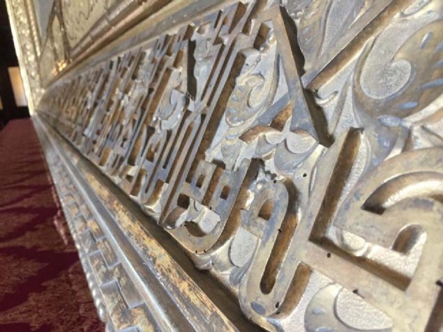 Tabloyu çok daha gösterişli kılan ise altın varak çerçevesi. Çerçevenin bordür kısmında desen gibi yapılan bu ayrıntıda, 'Kufi' hat ile yazılmış Al-i İmran Suresi'nin 126. ayeti yer alıyor. Ayette, 'Düşmanları bozguna uğratmak için gereken yardım ancak güçlü ve hâkim olan Allah katındandır.' deniliyor.