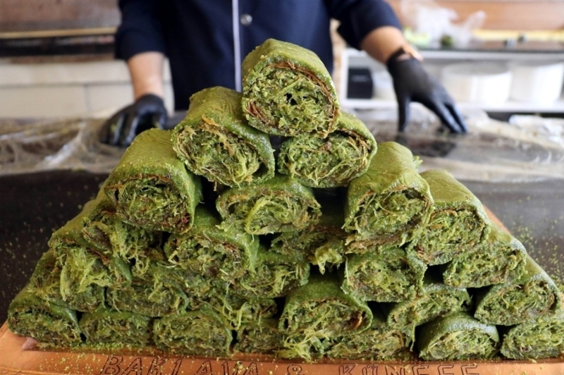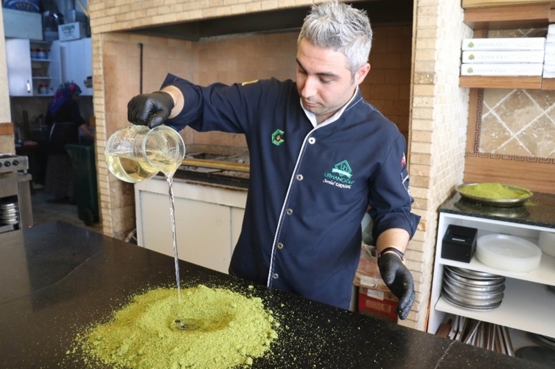 Çekilmiş Antep fıstığını şerbetle buluşturup yoğuran Urhan, fıstık ezmesiyle boru kadayıfı sarıp eşsiz bir lezzet ortaya koyuyor.
