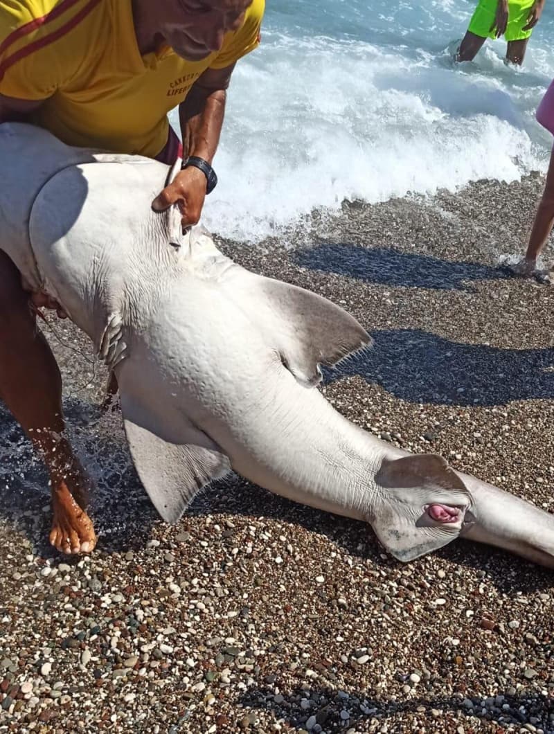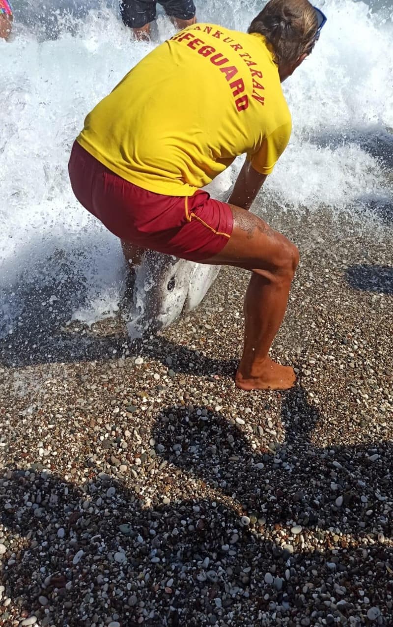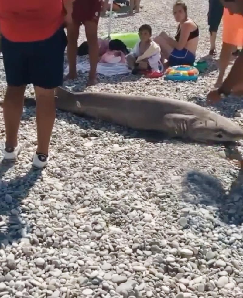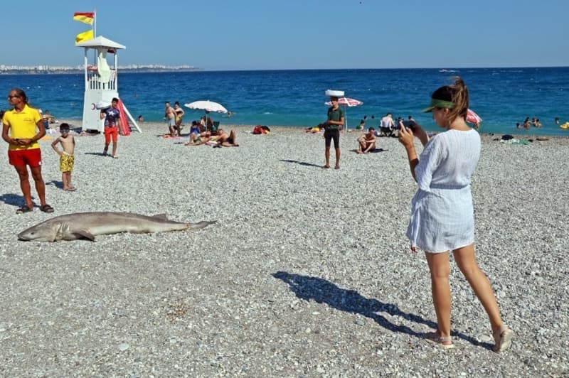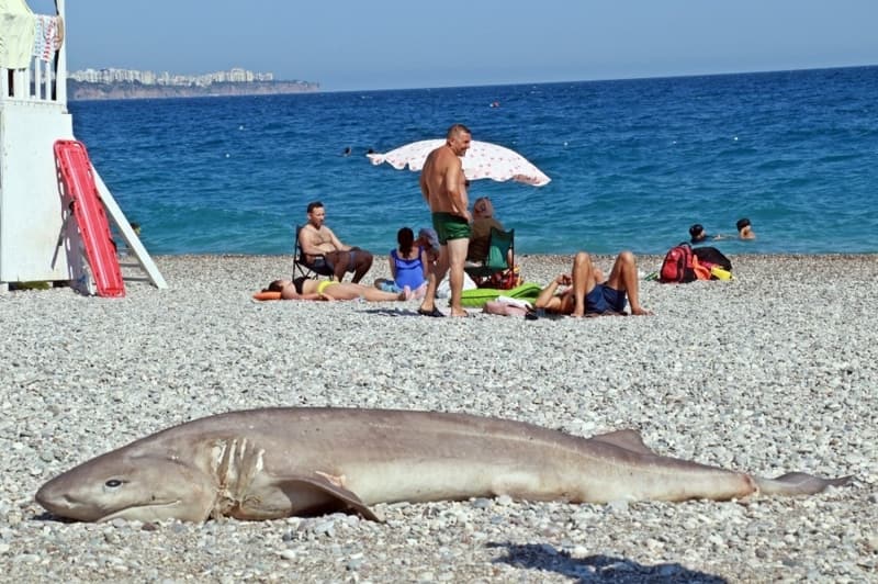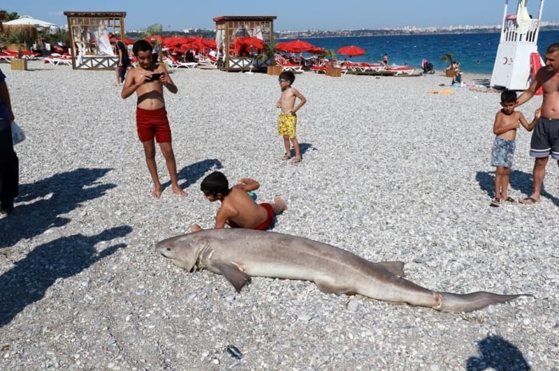 Antalya'nın dünyaca ünlü Konyaaltı Sahili'nde denize girenlerin ‘boğulan birisi' olduğunu düşünerek ihbar ettikleri cismin, köpek balığı ölüsü olduğu anlaşıldı. Yüzgecinden sürükleyerek kıyıya çıkarılan köpek balığının, 2 metre olduğu görüldü.